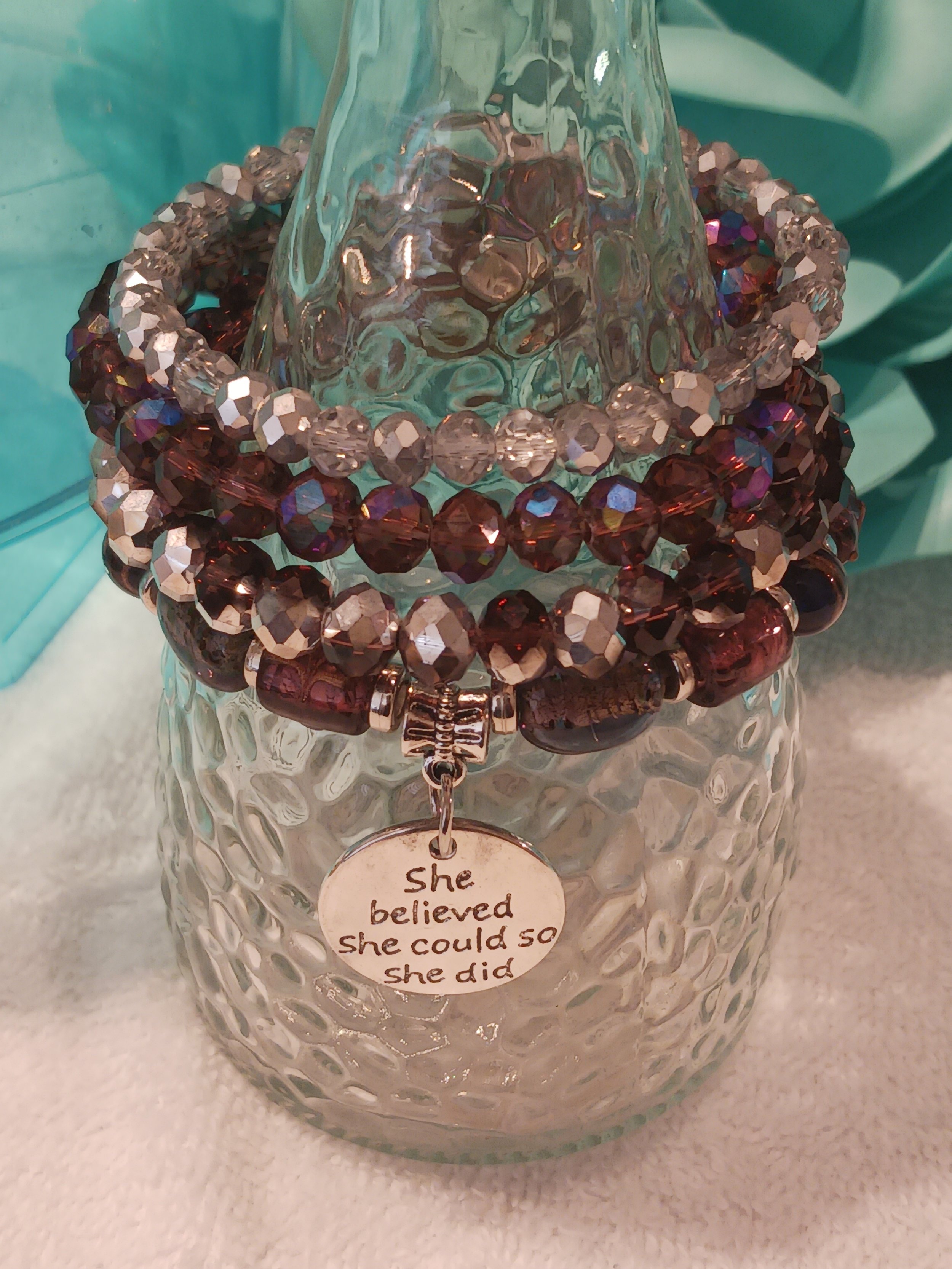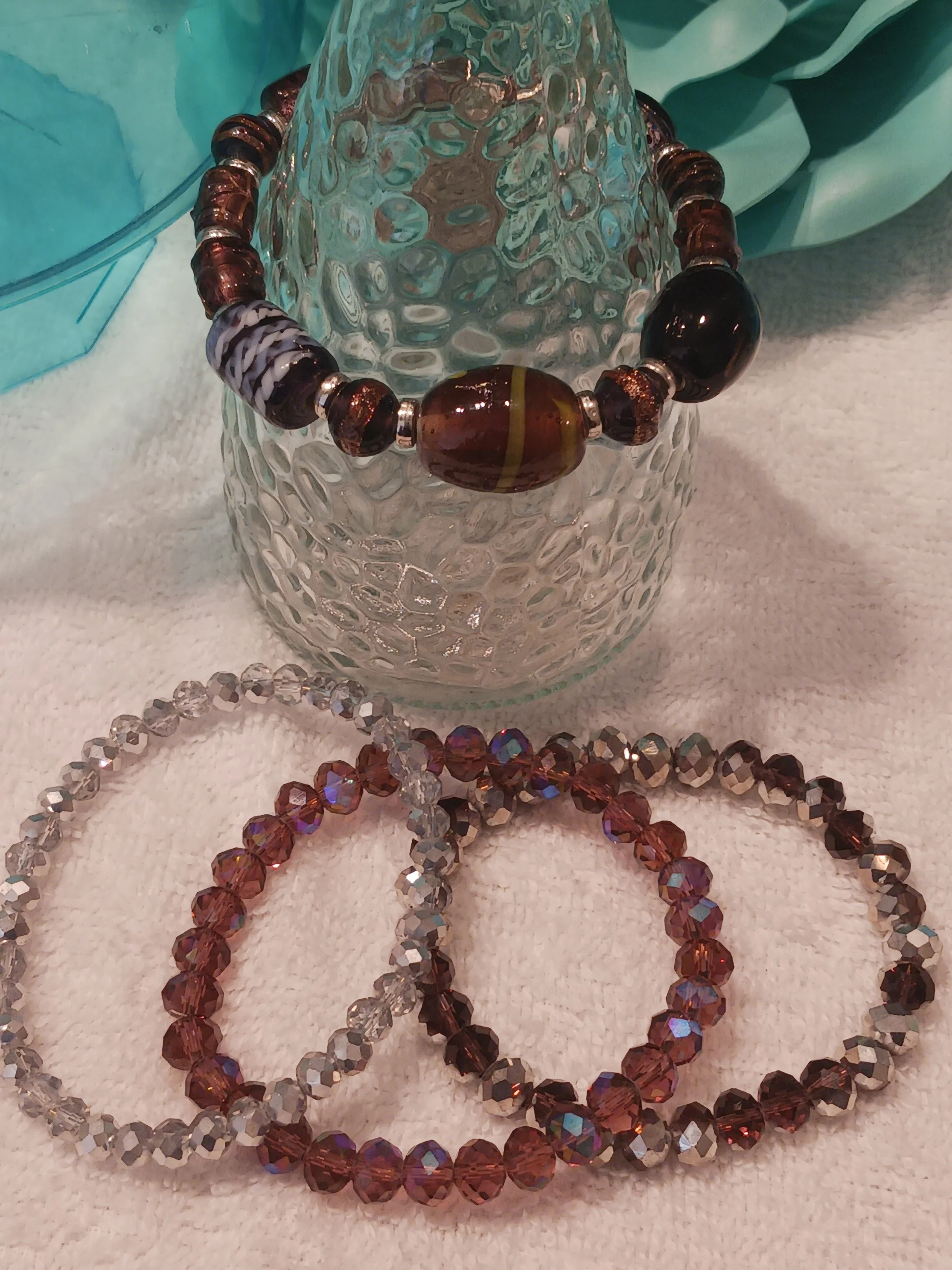 Set of 4 dark plum purplish African recycled glass beads, glass beads with radiant AB finish and the stainless steel silver adds major pop to this ensemble. The color is definitely in this season. This bold look will set off any outfit. Give her a try!